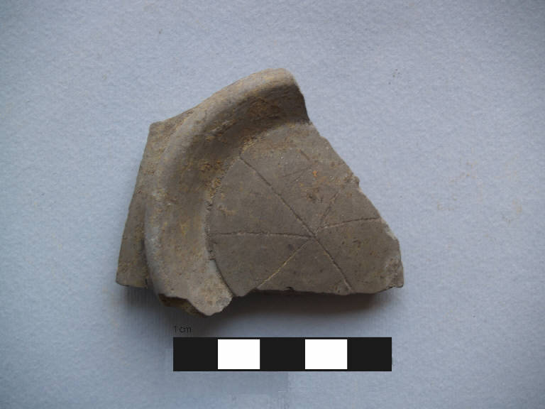 Parete+piede di ciotola.\nAttacco di vasca, piede ad anello svasato con fondo convesso; segni graffiti sul fondo esterno.\nCorpo ceramico molto compatto, con superficie liscia e compatta, con depurazione buona, con inclusi micacei di piccole dimensioni affioranti anche in superficie. Colore nucleo: grigio scuro; sup. esterna: grigio scuro; sup. interna: grigio scuro.