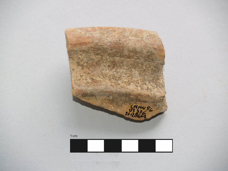 Orlo+parete decorata di mortaio.\nOrlo ingrossato a mandorla, attacco di vasca troncoconica; un cordone orizzontale 1,5 cm ca. al di sotto dell'orlo; grani minerali sulla superficie interna.\nCorpo ceramico poco compatto, con superficie farinosa, con depurazione buona, assenza di inclusi. Colore nucleo: beige chiaro; sup. esterna: beige chiaro, tracce di pittura di colore rosso dall'orlo fino al cordone compreso; sup. interna: beige chiaro, una banda dipinta di colore rosso nella parte superiore.