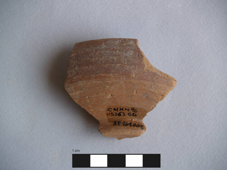 Orlo+parete+piede di ciotola.\nOrlo piatto, obliquo verso l'interno, labbro rientrante a profilo curvilineo, vasca a calotta poco profonda, piede ad anello leggermente svasato, fondo convesso; una leggera scanalatura sotto l'orlo all'esterno.\nCorpo ceramico compatto, con superficie farinosa, con depurazione buona, con pochi inclusi micacei di piccole dimensioni affioranti anche in superficie. Colore nucleo: rosato scuro; sup. esterna: rosato scuro, una banda dipinta di colore bruno nella parte superiore; sup. interna: dipinta di bruno.