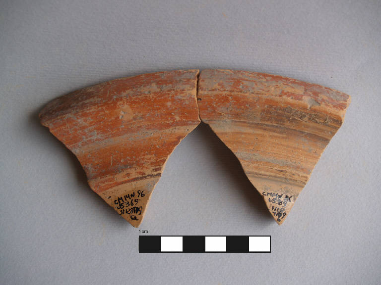 Orlo+parete decorata di mortaio. \nOrlo ingrossato a sezione triangolare, appiattito superiormente, vasca troncoconica poco profonda; un un cordone orizzontale 1,3 cm ca. al di sotto dell'orlo; grani minerali sulla superficie interna.\nCorpo ceramico molto compatto, con superficie liscia e compatta, con depurazione buona, assenza di inclusi. Colore nucleo: arancio-rosato; sup. esterna: arancio-rosato, una banda dipinta di colore rosso dall'orlo al cordone compreso; sup. interna: arancio-rosato, una banda dipinta di colore rosso nella parte superiore.\n2 frammenti combacianti.