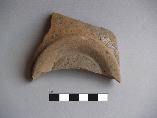 Parete+piede di ciotola.\nAttacco di vasca, piede ad anello diritto con base appiattita, fondo piano; una sottile solcatura tra l'attacco del piede e il fondo; segni graffiti sul fondo esterno.\nCorpo ceramico compatto, con superficie farinosa, con depurazione buona, con pochi inclusi micacei di piccole dimensioni affioranti anche in superficie. Colore nucleo: grigio-beige; sup. esterna: grigio-beige; sup. interna: grigio-beige.