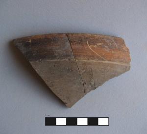 Orlo+parete di ciotola.\nOrlo arrotondato, labbro verticale a profilo rettilineo con una leggera rastrematura al centro del profilo esterno, carena netta, vasca troncoconica profonda.\nCorpo ceramico compatto, con superficie farinosa, con depurazione buona, assenza di inclusi. Colore nucleo: irregolare da beige a beige-grigio; sup. esterna: beige, una banda dipinta di colore bruno sul labbro; sup. interna: dipinta di bruno.\n2 frammenti combacianti.