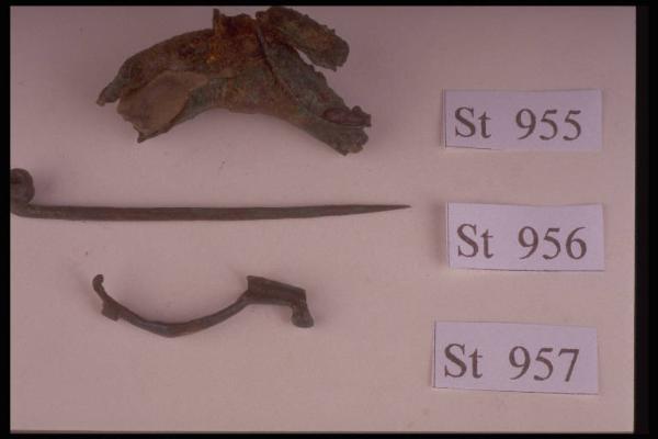 Fibula a sanguisuga tipo Mazzucca di Montanaso con anima in cotto e arco decorato da linee trasversali parallele incise.