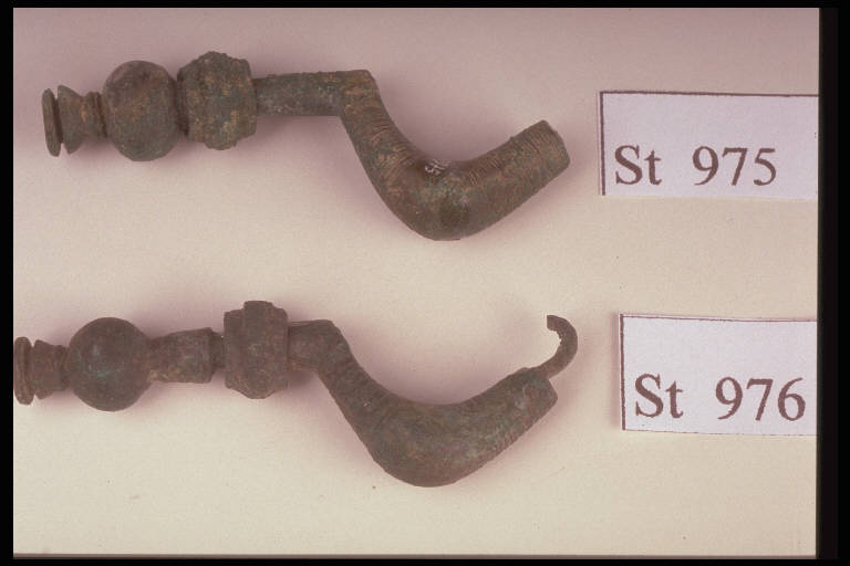 Fibula a sanguisuga con anima in cotto di tipo Tardo Alpino var. C, con lunga staffa terminante a globetto con bottone troncoconico profilato; anello fermapieghe, staffa e arco decorato da linee incise