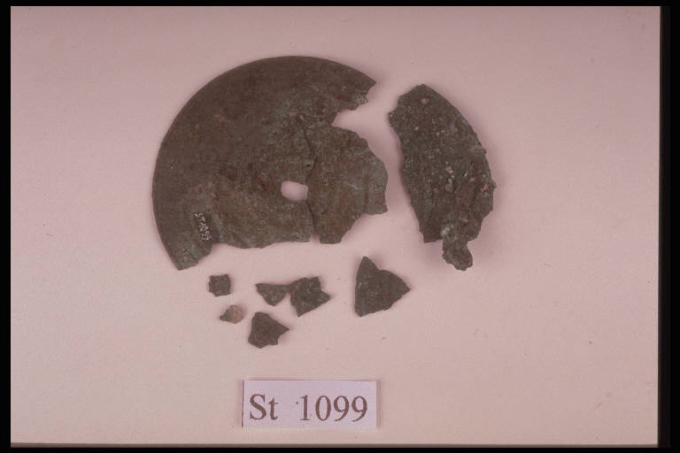 Disco di lamina decorato a sbalzo da costolature concentriche, file di puntini e occhi di dado disposti a coppie
