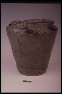 Situla a corpo troncoconico, breve spalla arrotondata, collo cilindrico; i due occhielli per l'attacco del manico sono impostati sulla spalla. Formata da tre lamine i cui margini sono sovrapposti e fissati da ribattini