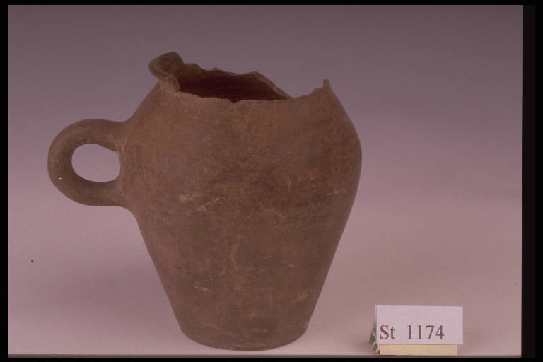 Boccale a corpo ovoide con ansa verticale a bastoncello, orlo cordonato. Superficie di colore bruno nerastro non omogeneo.