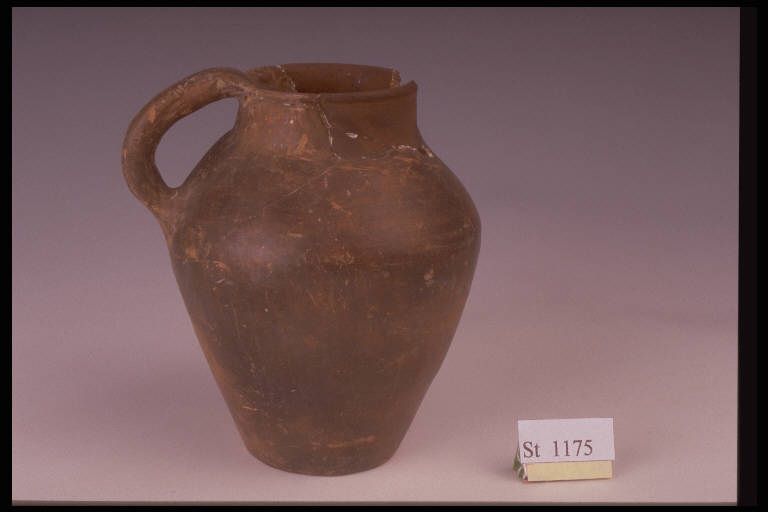 Brocchetta a corpo ovoide, collo cilindrico, piccolo orlo ingrossato, ansa a bastoncello impostata su orlo e spalla. Superficie di colore non omogeneo nerastro bruno.