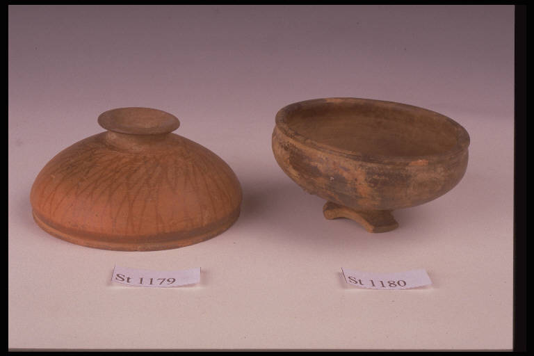Coppetta su basso piede con piccola gola sotto l'orlo. Impasto di colore arancio, decorato da stralucido rosso a reticolo.