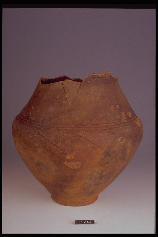 Urna biconica con piccolo piede svasato, fondo concavo, decorazione a finta cordicella e a trattini obliqui sul collo; una fascia di denti di lupo, di finta cordicella, di un motivo a zigzag e linee oblique in corrispondenza del diametro massimo. Superficie di colore grigiastro, frattura arancio con sottili bordi grigi.