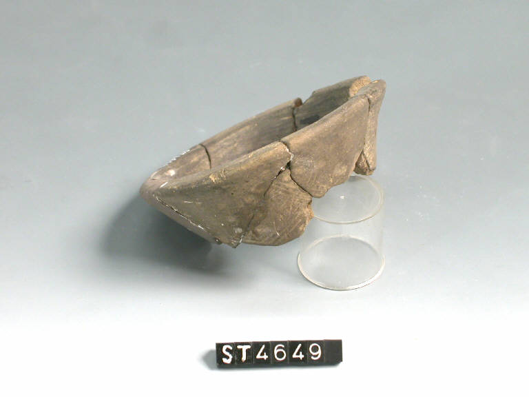 Piede troncoconico decorato da fasci di linee incise disposte a zig-zag e da coppelle impresse. Colore nerastro.