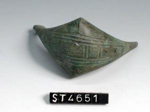 Arco di fibula a navicella romboidale, decorato da fasci di linee parallele oblique e longitudinali; queste ultime comprendono motivi metopali.