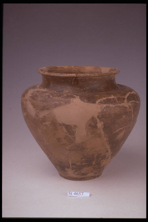 Urna a corpo ovoide con collo cilindrico e orlo esoverso. Colore nocciola; superficie bruno nerastra semi-lucida