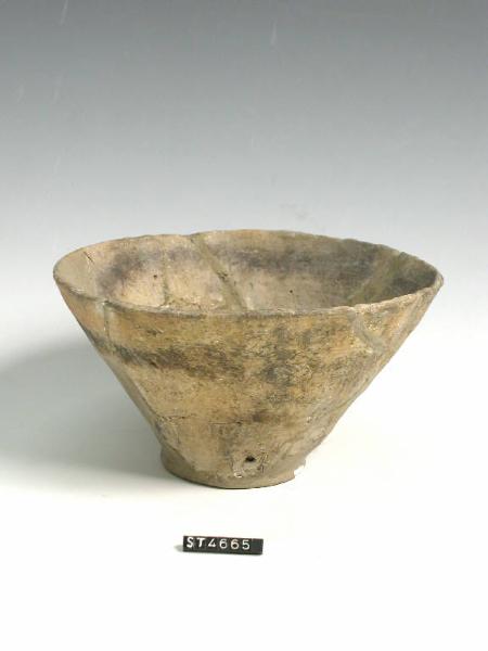 Ciotola a corpo troncoconico, fondo piano. Decorazioni incise a fasci di linee parallele. Colore non omogeneo nocciola nerastro.