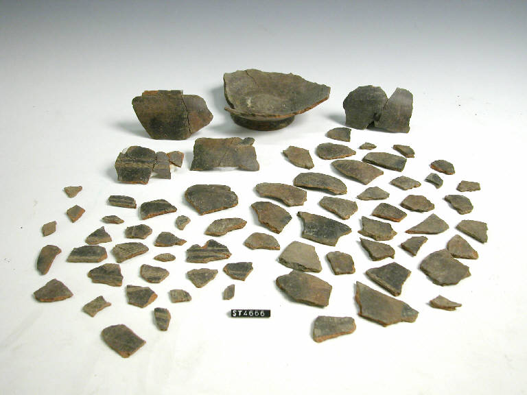 Urna di forma non riconoscibile decorata a denti di lupo incisi. Colore arancio, superficie bruno-nerastra.