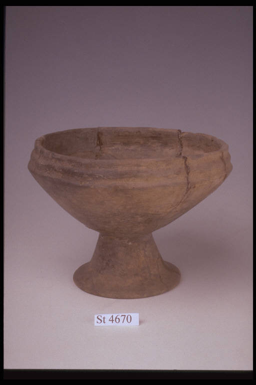 Coppa su medio piede svasato a tromba, orlo rientrante con tre costolonature. Colore non omogeneo nocciola nerastro.