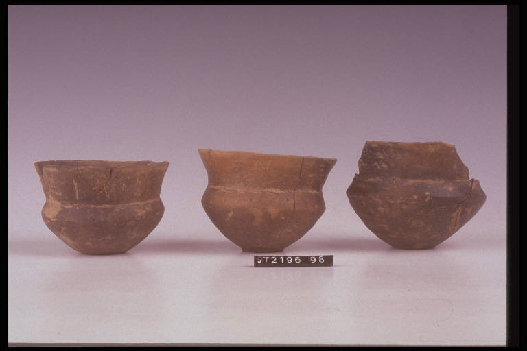Bicchiere carenato con fondo ombelicato e gola accentuata da una piccola scanalatura. Colore nerastro.