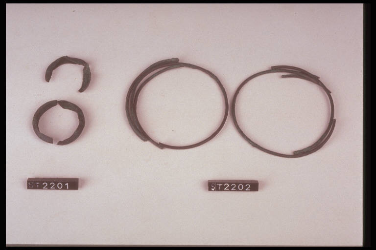 Frammenti pertinenti a due anelli di lamina bronzea con sezione a V.