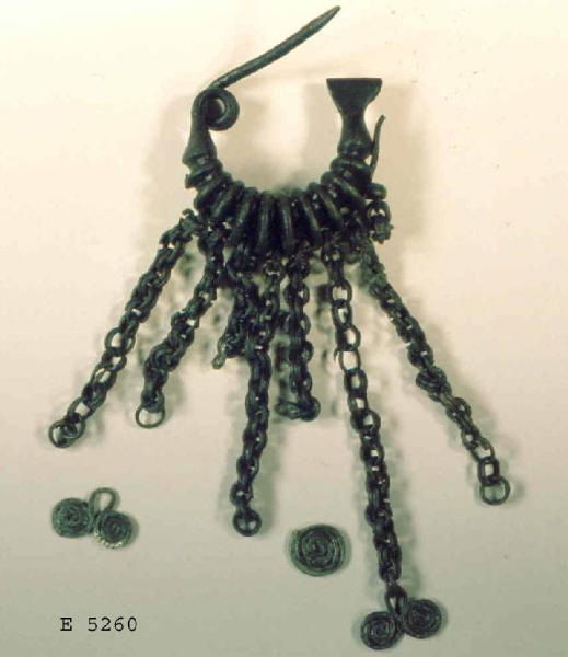 Fibula a grandi coste da cui pendono catenelle desinenti in pendagli a doppia spirale