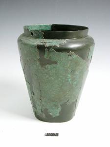 Situla in lamina bronzea, breve collo cilindrico, spalla cordonata.