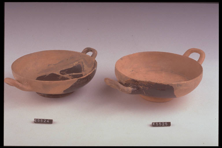 Kylix attica a vernice nera, sul fondo reca fasce concentriche dipinte in vernice rossa e nera alternate.