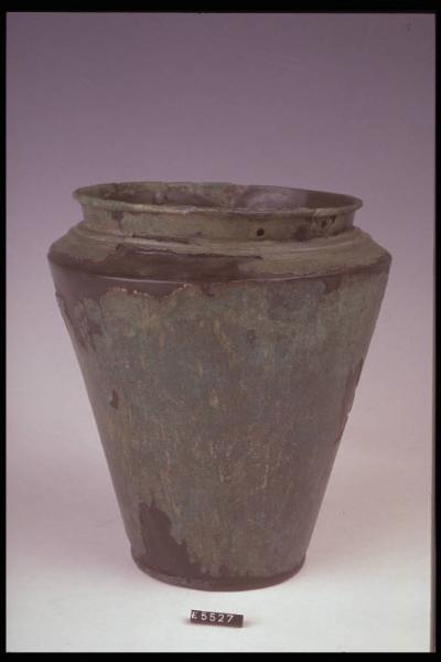 Situla a collo cilindrico, spalla cordonata; manici staccati in antico: sono ancora visibili i fori per i ribattini.