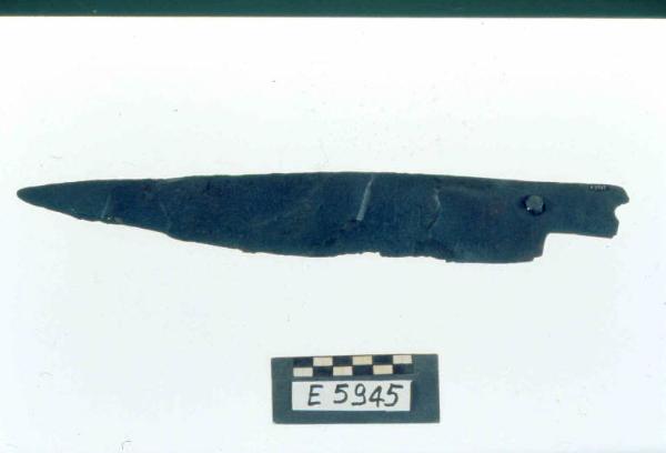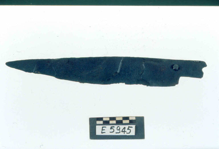 Coltello a dorso rettilineo e taglio concavo-convesso, codolo piatto che conserva due ribattini