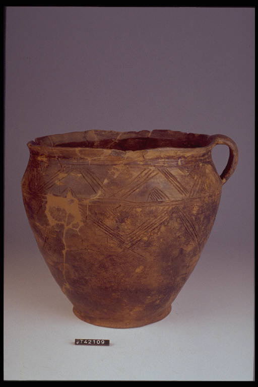 Boccale a corpo troncoconico con ansa a nastro, breve labbro svasato.