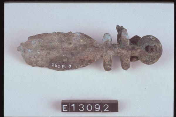 Pendaglio a spatola decorato ad incisione da cerchietti con punto centrale. L'elemento che unisce la spirale all'anello di sospensione è attraversato da due sbarrette ad esso perpendicolari.