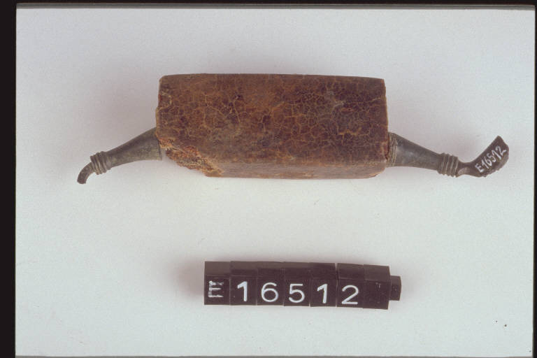 Fibula ad arco composito con perla d'ambra a sezione quadrangolare