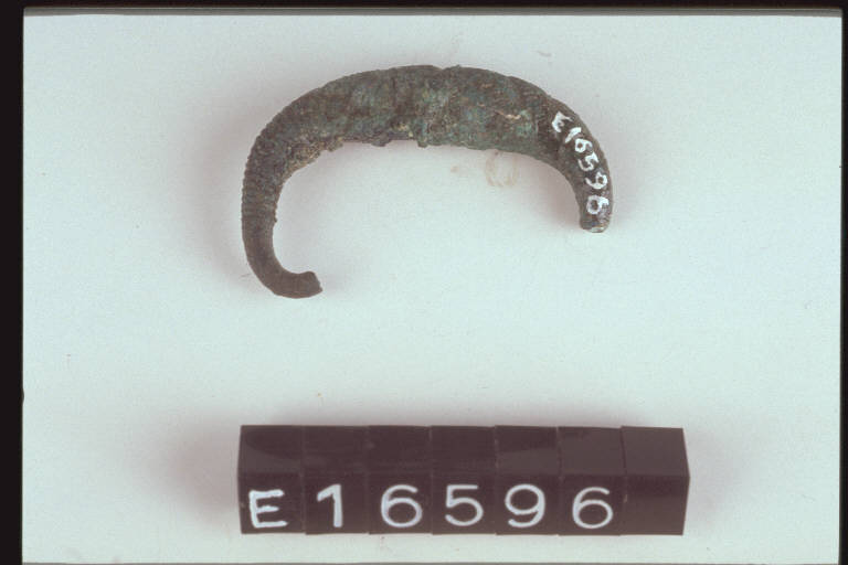 Fibula ad arco ribassato, ingrossato, decorato ad incisione, a spirale alle estremità e da fasci di linee parallele oblique nella parte centrale