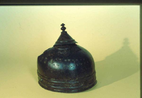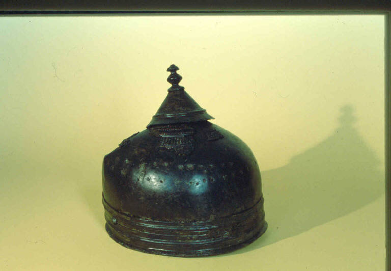 Elmo in ferro rivestito da una lamina decorata a sbalzo