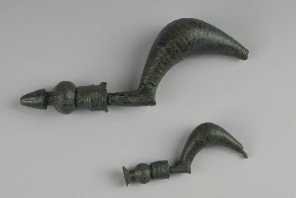 Fibula a sanguisuga tipo Lodigiano, variante B. Arco simmetrico con anima in cotto decorato da fasci di tre nervature che si raccordano nella parte centrale,lunga staffa decorata da linee incise che si conclude con un segmento ingrossato decorato da fasci di tre nervature,appendice a globetto con bottone terminale,conico,decorato da incisioni. Manicotto ferma-ago con nervature trasversali. Priva della molla e dell'ago.