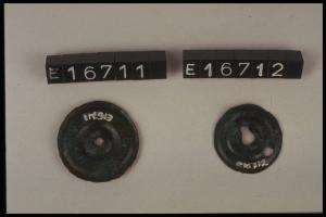 Dischetto di lamina decorato a sbalzo da puntini compresi fra costolature concentriche