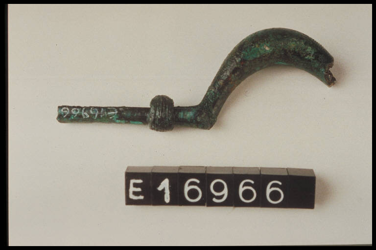 Fibuletta a sanguisuga con corpo pieno, decorato alle estremità da fasci di linee parallele e lunga staffa con anello ferma-ago