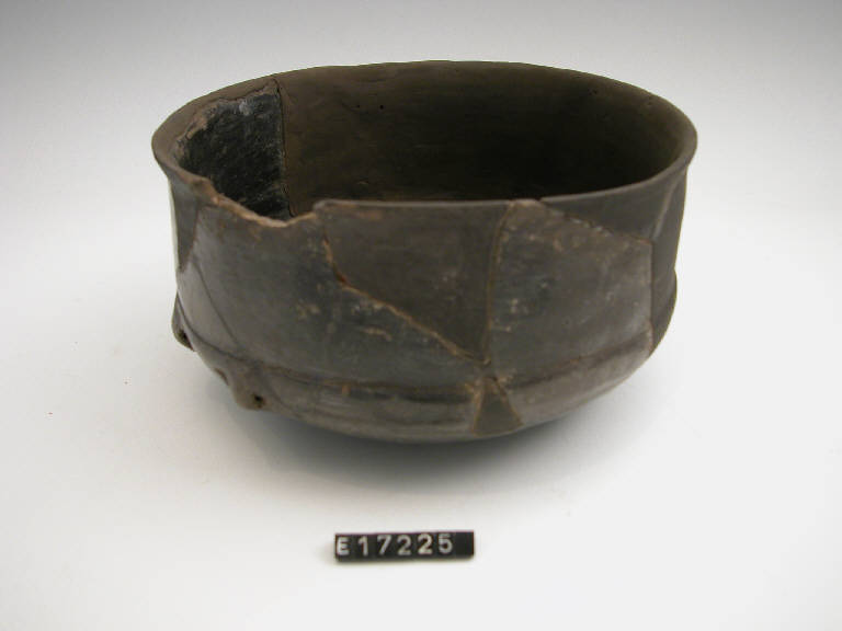 Ciotola a fondo convesso, alta parete verticale, labbro appena distinto, solcatura sopra il diametro massimo; provvista di una coppia di bugne perforate