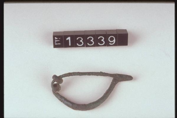 Fibuletta ad arco a sezione piano convessa con decorazione lineare e un anellino infilato sull'arco.