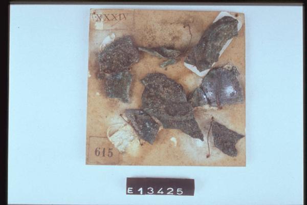Frammenti di disco di lamina decorato a sbalzo da puntini.