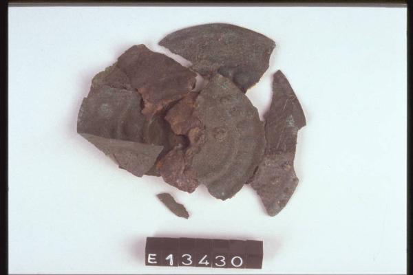 Disco di lamina decorato a sbalzo da puntini e costolonature.