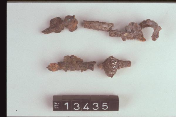 Frammenti nei quali si riconoscono parte dell'arco e della staffa di una fibula ad arco serpeggiante.