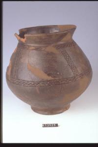 Urna biconoca decorata da fasce a reticolo incise.