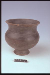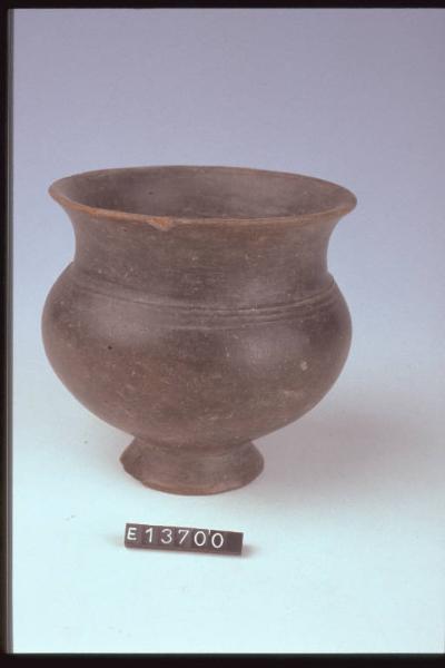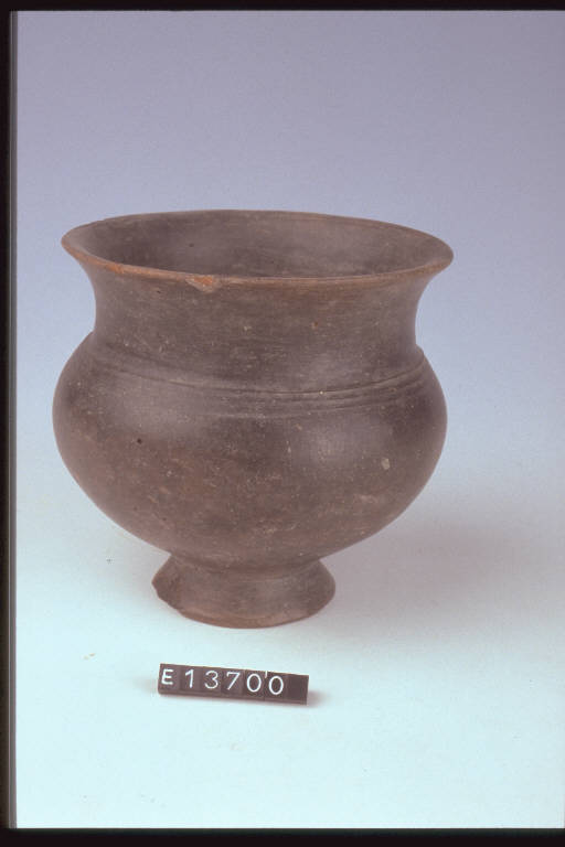 Bicchiere a corpo globulare, basso piede obliquo, con 5 linee incise sopra la spalla.