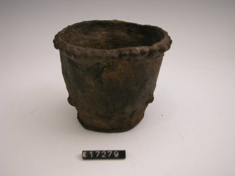Vaso troncoconico decorato da un filo continuo di bugnette lungo l'orlo.