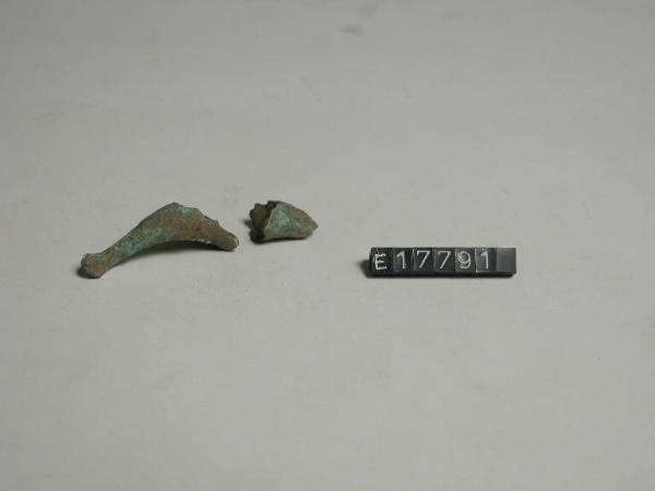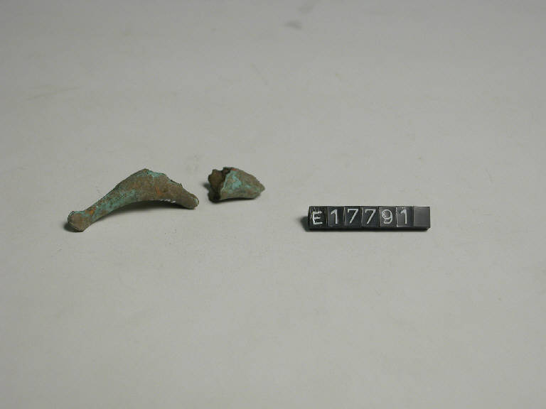 Due frammenti combacianti di fibula a sanguisuga con anima in cotto; sulla superficie, all'estremità prossima alla staffa, motivo a linee incise trasversali.