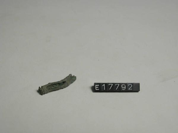 Un frammento di staffa di fibula con inserita parte dell'ago; terminazione a doppio collarino.