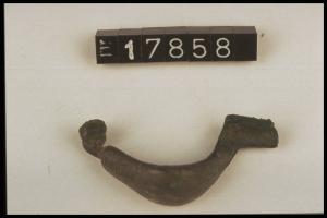 Arco della fibula schiacciato con decorazione costituita da due fasce di solcature fitte alle estremità.