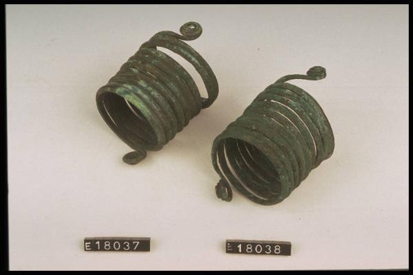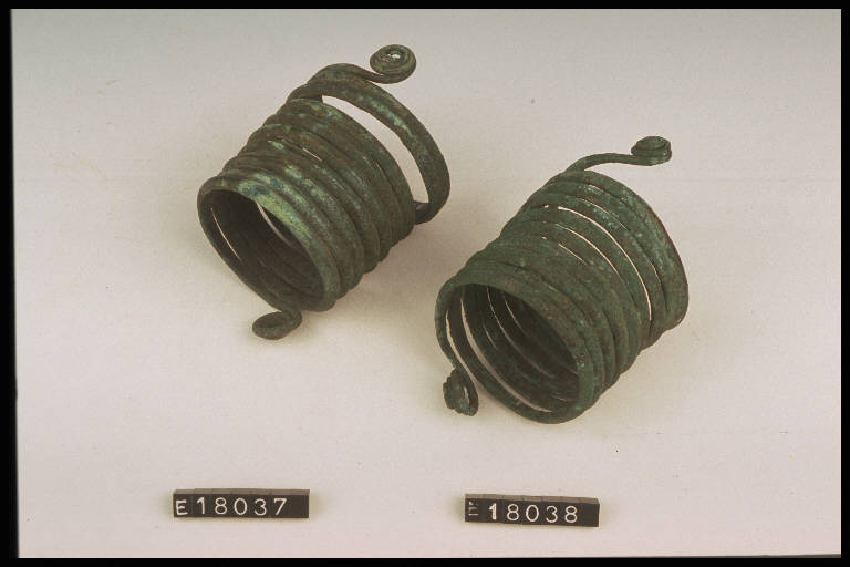 Armilla in verga di bronzo a sezione triangolare avvolta a spirale.