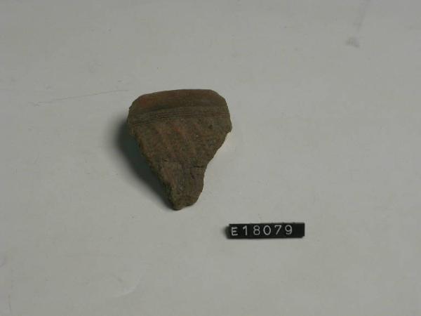 Frammento di orlo e parete con decorazione a solcature ed impressioni.