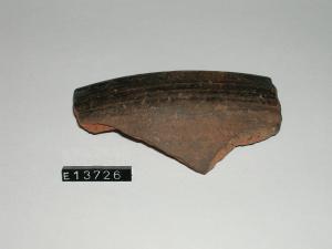 Frammento di orlo e parete di ciotola, a labbro verticale e orlo arrotondato. Sono dipinte la superficie interna e una fascia sul labbro esterno.