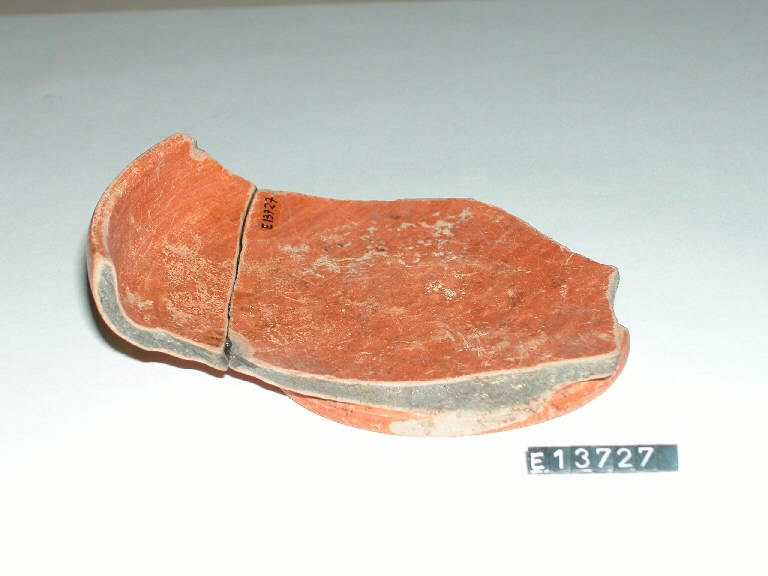 Frammento di ciotola, a corpo poco profondo e labbro verticale; la superficie superiore è rossa.
